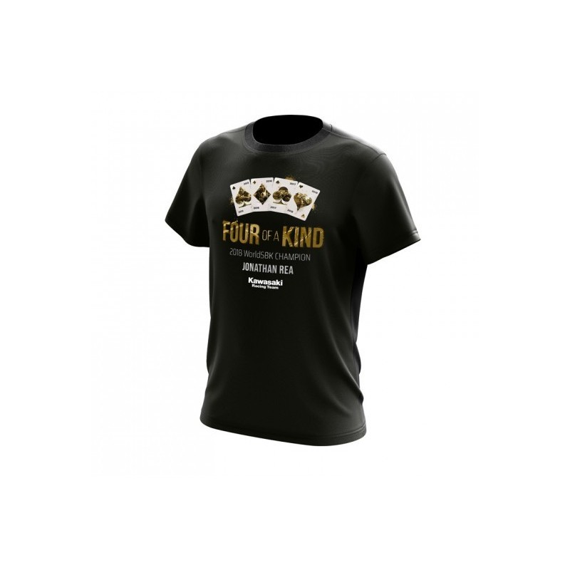 Camiseta que forma parte del Merchandising oficial de Jonathan Rea y Kawasaki para celebrar su cuarto mundial del Campeonato del Mundo de Superbikes de 2018. Fue la camiseta que se usó en la celebración del título por parte del personal del equipo, familia y amigos.